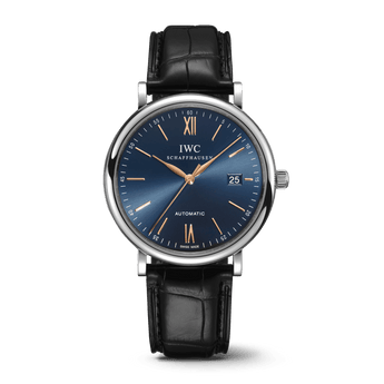 The IWC Schaffhausen Portofino Automatic features a 40mm stainless steel case paired with a striking blue dial, now offered in an unlimited edition. Powered by the Calibre 35111 movement, it delivers a reliable 50-hour power reserve and includes a date display. Designed for durability and clarity, it boasts sapphire crystal glass and is water resistant up to 30 meters, combining elegant design with technical precision.