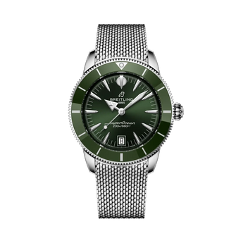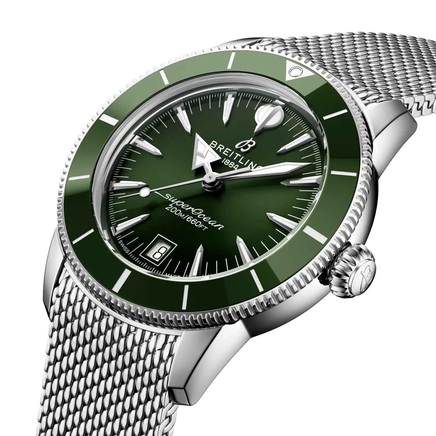 The Breitling Superocean Heritage blends 1950s spirit with modern engineering. Inspired by the Ref. 1004 and Ref. 807, it retains the original spear-and-arrow hands, clean proportions, and unmistakable style. Today’s evolution introduces the B31 automatic movement—Breitling’s first exclusive three-hand manufacture caliber—along with a ceramic-inlayed bezel for exceptional durability. Integrated mesh-metal or mesh-rubber bracelets create a streamlined, secure fit, while a date window at six ensures balance and legibility above or below the surface.
