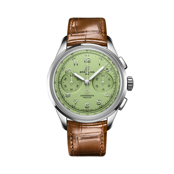 Honouring three generations of Breitling inventors, the Premier Chronograph embodies the Maison’s legacy of creating the modern chronograph. Featuring rectangular pushers, bi-compax layout, Arabic numerals, and vintage-inspired hands, this heritage-revived model pairs elegance with technical mastery. Presented in stainless steel with a pistachio green dial and gold-brown alligator strap, or in 18k red gold with a silver dial and brown strap, it is powered by the COSC-certified, manually wound Manufacture Caliber B09. Open sapphire casebacks and refined case-side grooves complete the timeless design, celebrating Willy Breitling’s vision of impeccable taste.