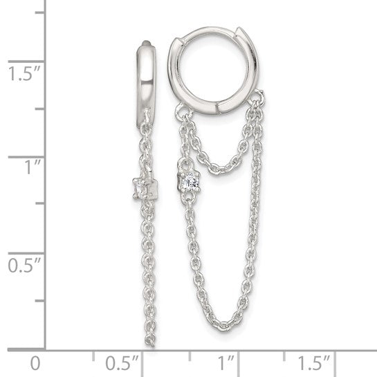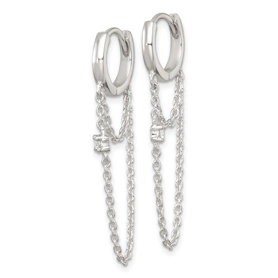 Sterling Silver CZ Dangling Chain Round Hinged Hoop Earrings