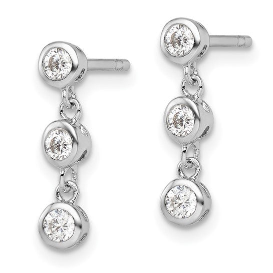 These sterling silver post dangle earrings feature a polished rhodium finish and three sparkling cubic zirconia stones. Elegant and versatile, they offer a subtle sparkle that complements any outfit. Perfect for everyday wear or special occasions, their lightweight design ensures comfortable all-day wear.