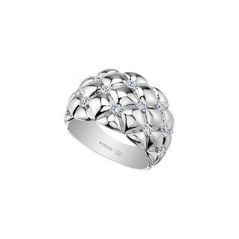 This exquisite 14K white gold ring from Shelly Purdy Design showcases a distinctive quilted texture that catches light beautifully. Set with a 1/2 carat of sparkling Canadian Maple Leaf diamonds in FG color and SI2 clarity, the piece balances contemporary design with timeless elegance. The quilted motif adds dimension and visual interest, making this ring a sophisticated choice for those seeking refined craftsmanship and modern artistry in fine jewelry.