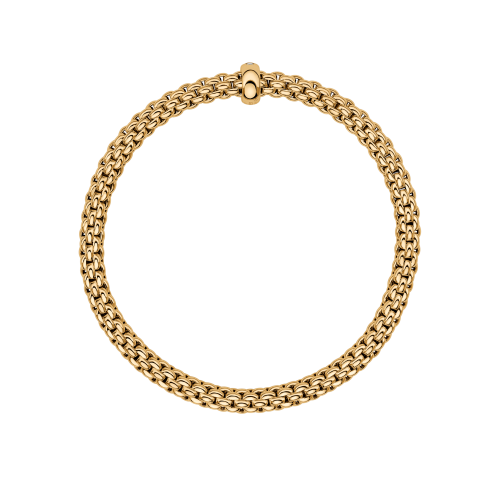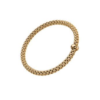 In FOPE’s Solo collection, the iconic medium Novecento mesh becomes a luminous tapestry of gold, catching the light with every movement. The flexible design embodies the brand’s signature comfort, while the refined D-click clasp—elegantly set with diamonds—adds a touch of brilliance and modern sophistication. The result is a piece that feels as exceptional as it looks.