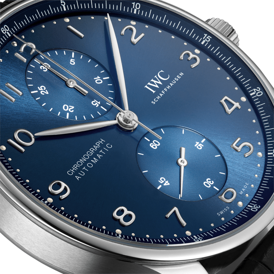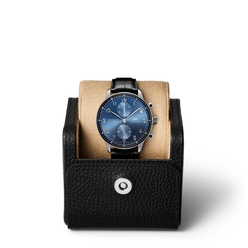The Portugieser Chronograph is one of IWC Schaffhausen’s most iconic models. With its compact diameter of 41 millimetres, it fits almost any wrist. However, the thin bezel gives one the impression of wearing a significantly larger watch. The clear, functional dial boasts applied Arabic numerals and slender Feuille hands. Printed with a quarter-second scale, the characteristic réhaut not only allows precise reading of the stop time but also reminds us of the Portugieser’s origins as a nautical precision instrument for the wrist. This model features a stainless steel case, a blue dial, as well as rhodium-plated hands and appliqués; it is fitted with a black alligator leather strap. Inside the sporty-elegant chronograph, the IWC-manufactured 69355 calibre is at work. The robust and precise chronograph movement in classic column-wheel design is visible through a sapphire-glass case back.