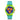 This neon-colored chronograph is inspired by a 90's Swatch CHRONO: NEO WAVE. The multi-colored dial with tachymeter scale boasts glow-in-the-dark black hour and minute hands, an orange seconds hand and a day window at 3 o'clock. It has a transparent matte yellow case with a matching bezel. The structured turquoise strap is accented with contrasting transparent matte yellow and orange loops and a transparent matte blue buckle.
