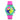 This neon-colored chronograph is inspired by a 90's Swatch CHRONO: FLASH ARROW. The multi-colored dial with tachymeter scale boasts glow-in-the-dark black hour and minute hands, a yellow seconds hand and a day window at 3 o'clock. It has a transparent matte green case with a matching bezel. The structured pink strap is accented with contrasting transparent matte yellow and blue loops and a transparent matte green buckle.