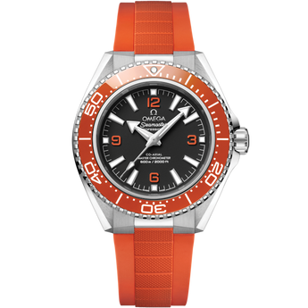 The OMEGA Seamaster Planet Ocean 42 mm blends dive heritage with bold modern design. Its polished-brushed stainless steel case pairs with an orange ceramic bezel with white hybrid ceramic diving scale, a matte black dial, and rhodium-plated hands and indexes with Super-LumiNova. Orange Arabic numerals add a vibrant touch. Powered by the Master Chronometer Calibre 8912, it ensures precision and durability. Worn on an orange rubber strap with stainless steel link and foldover clasp, the watch features a titanium screw-in caseback with OMEGA’s iconic seahorse emblem, completing this dynamic dive watch.