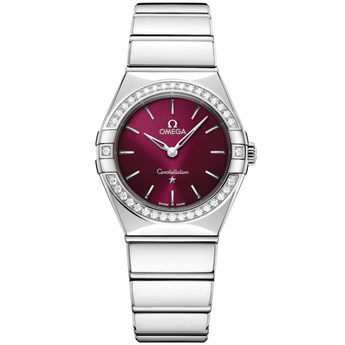 The OMEGA Constellation 28mm (ref. 131.15.28.60.11.001) captures celestial beauty with a diamond-paved bezel and sun-brushed burgundy dial finished in tinted lacquer. Crafted in stainless steel, this iconic design features the Constellation’s signature half-moon facets and polished claws. Polished 18K white gold hands, hour markers, and the emblematic star at six o’clock complete the refined aesthetic. Presented on a polished mono-rang bracelet with easy comfort-adjustment, the watch is powered by the OMEGA Calibre 4061, revealed through the stamped Constellation Observatory medallion caseback.