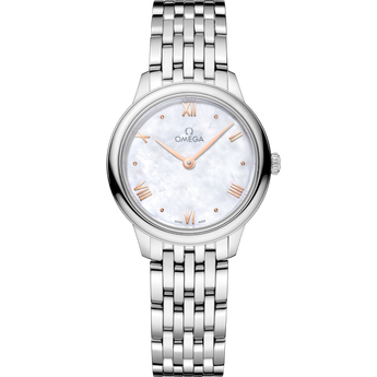 A symbol of refined elegance, the OMEGA De Ville Prestige 27.5 mm (ref. 434.10.28.60.05.001) blends timeless design with contemporary sophistication. Its white mother-of-pearl dial is accented by PVD Sedna™ Gold hands, Roman numerals, and cabochon indexes, creating a graceful, luminous aesthetic. Crafted in stainless steel with a matching bracelet, this timepiece is powered by the OMEGA Quartz Calibre 4061, offering exceptional precision and a 48-month battery life.