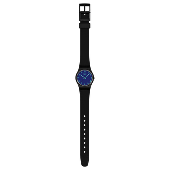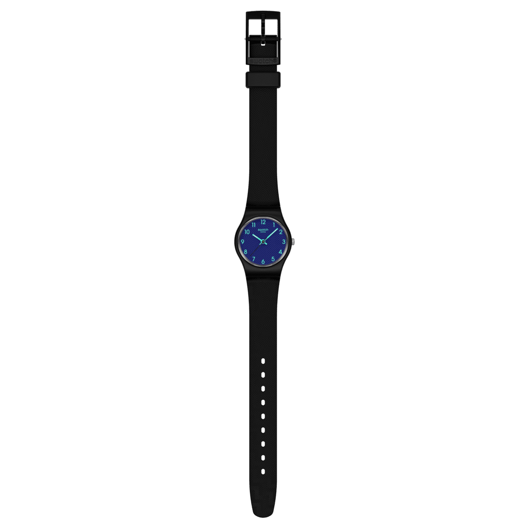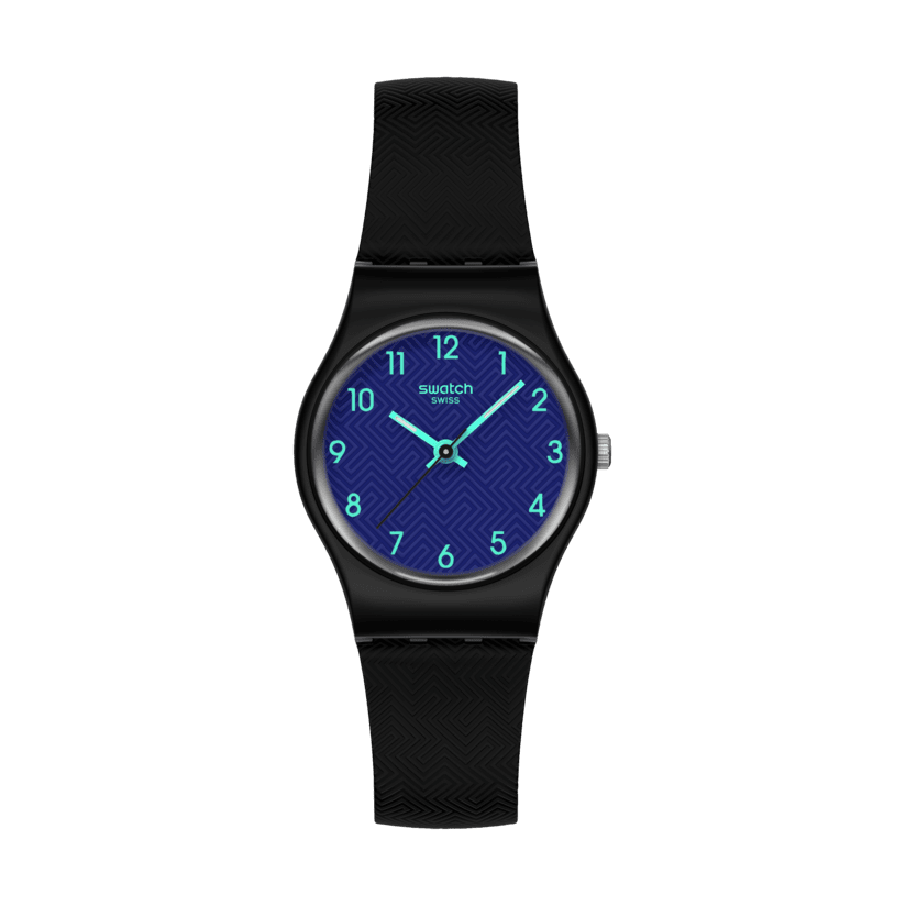 This small Swatch watch features a textured dark blue dial with light green printed numerals, hour and minute hands that have a glow-in-the-dark effect. A textured, matte black strap with matte black loop and matte black case completes the watch.