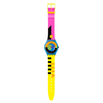 This ultra-slim watch draws inspiration from the iconic 1980s Swatch GENT collectible FLUMOTIONS. Its vibrant dial includes a black hour hand and pink minute hand, housed in a matte transparent blue bio-sourced case. The strap combines a matte yellow lower section and a matte pink upper section, both adorned with multi-colored prints, finished with a matte transparent loop and a matte transparent yellow buckle for a cohesive look.