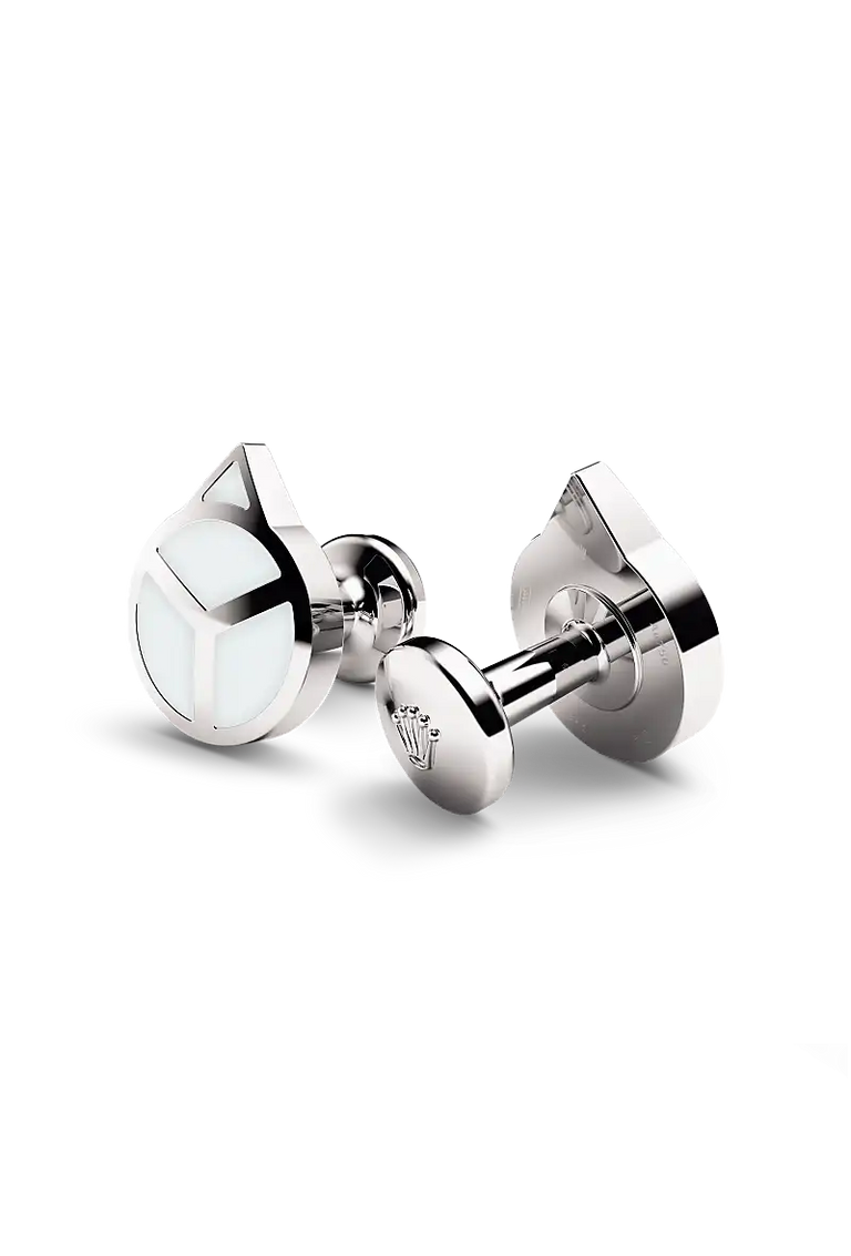 These cufflinks bring together several signature elements of Rolex watches. In the centre, the five-pointed crown is engraved on a Cerachrom disc in ceramic, which is surrounded by fluting that evokes the emblematic bezel seen on Classic Rolex models.