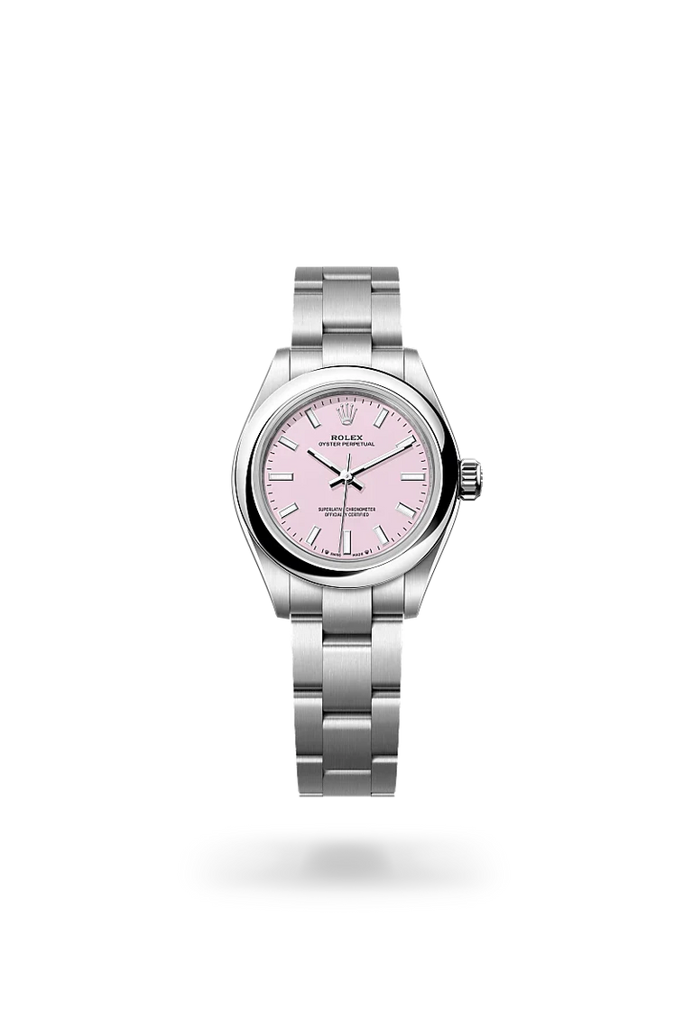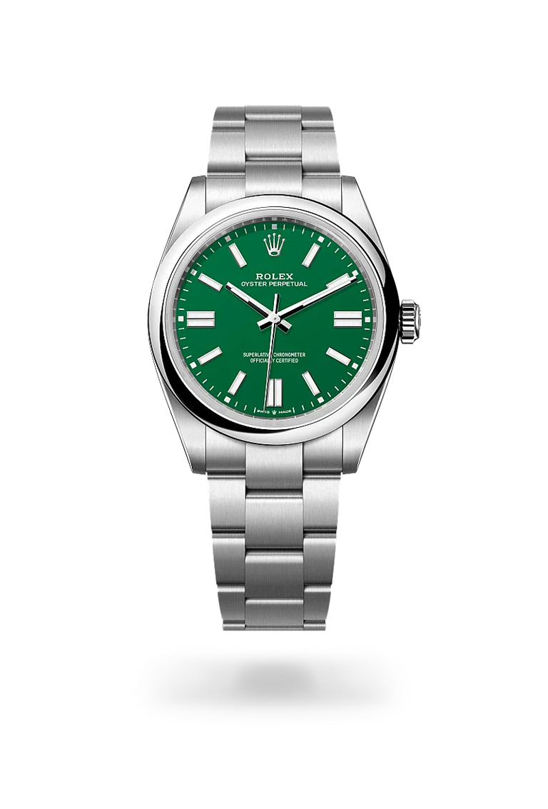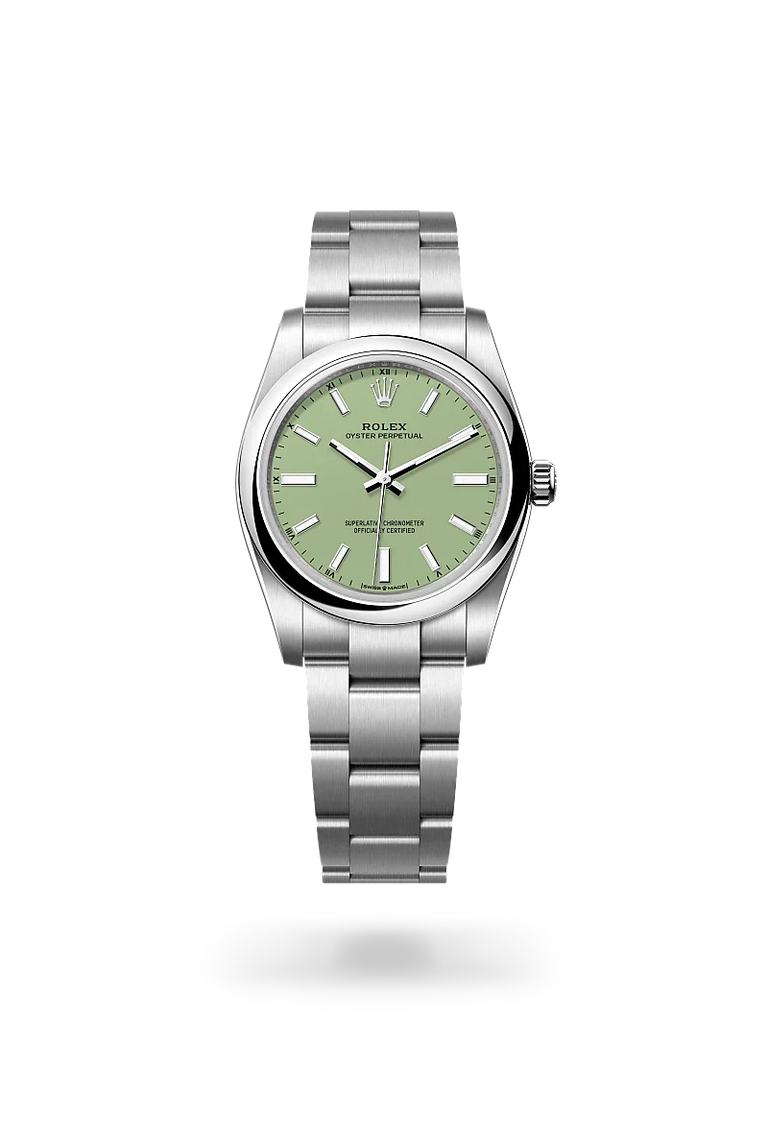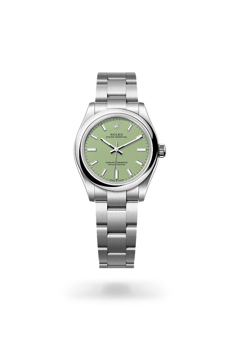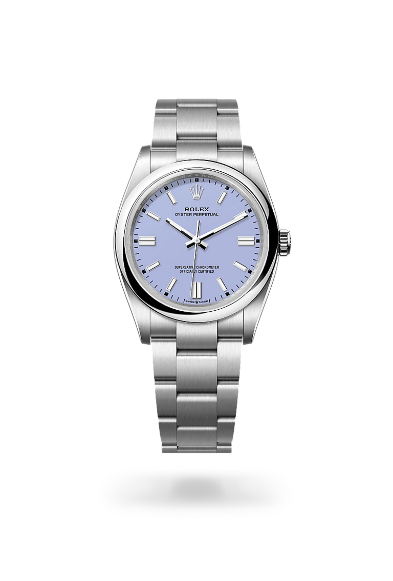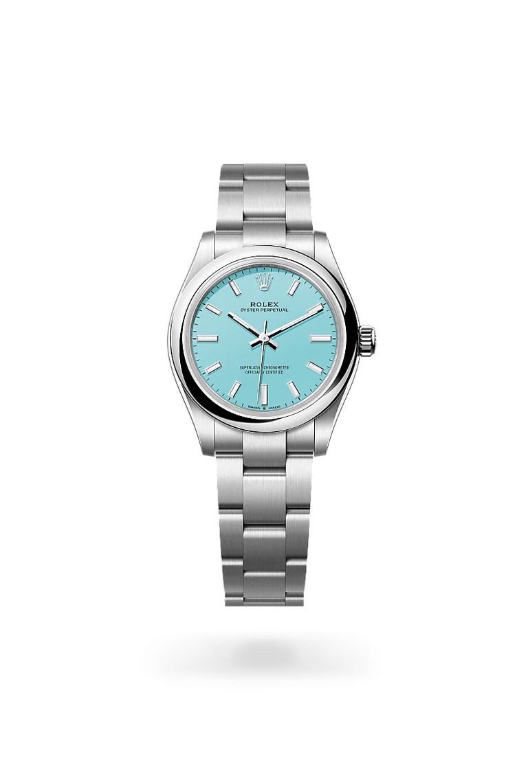 The Oyster Perpetual provides a clear and accurate time display – hours, minutes and seconds. The different versions of the watch stands out with dials in various colours, subtle or vibrant: a range of different faces, always sporting a contemporary look. From beige, lavender or pistachio matt lacquer, to candy rose, green, turquoise blue, black or med blue lacquer or sunray-finish silver, they match any style. The Oyster Perpetual comes in five sizes – 28, 31, 34, 36 and 41 mm – providing the largest choice of diameters for a Rolex range.
