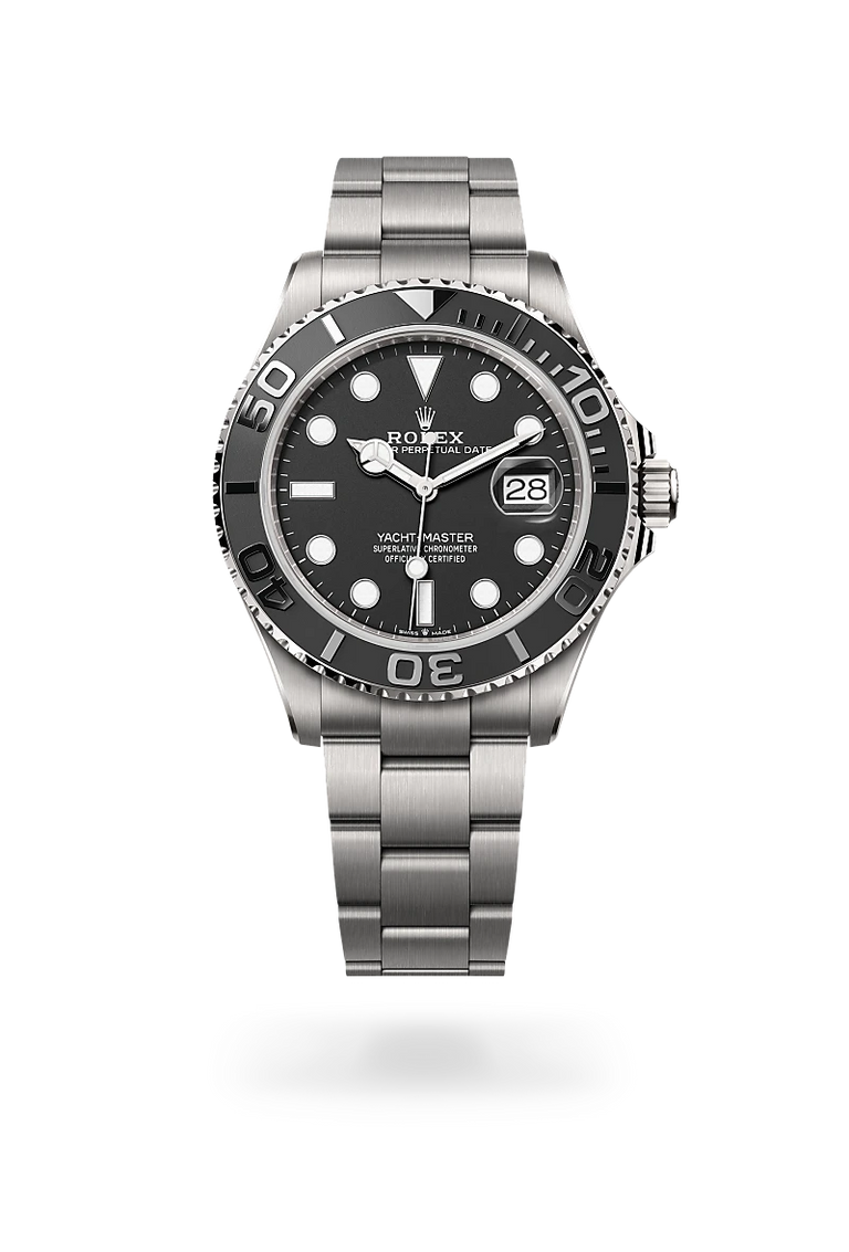The Yacht-Master 42 is available in 18 ct yellow or white gold with an Oysterflex bracelet and in RLX titanium – a particularly lightweight alloy with excellent corrosion-resistance properties and high mechanical strength – with an Oyster bracelet. This version, unveiled in 2023, stands out for its technical satin finish, a finish with a visible grain.