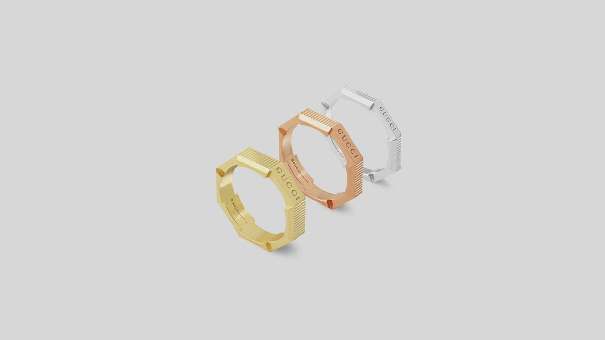 From Gucci’s Link to Love collection, this 18K rose gold mirrored ring reflects modern romance and versatile styling. The 3mm band features a sleek mirror finish and a stackable mechanism, designed to be worn alone or layered with other rings in the collection. Blending masculine and feminine lines, the piece celebrates individuality through personal expression. Crafted in Italy, it also reflects Gucci’s commitment to responsible sourcing and sustainability. Elegant yet contemporary, this ring is a timeless symbol of love and style.