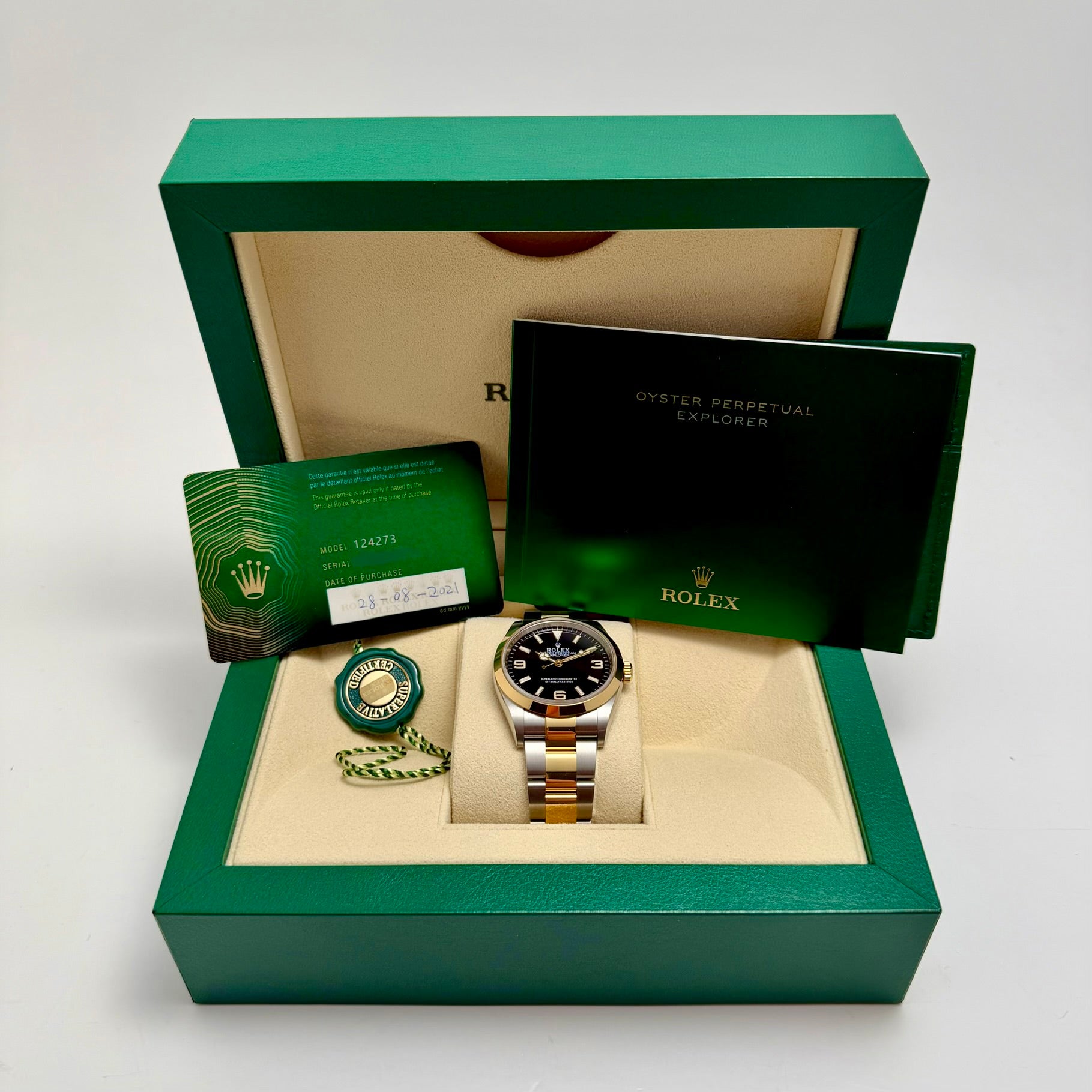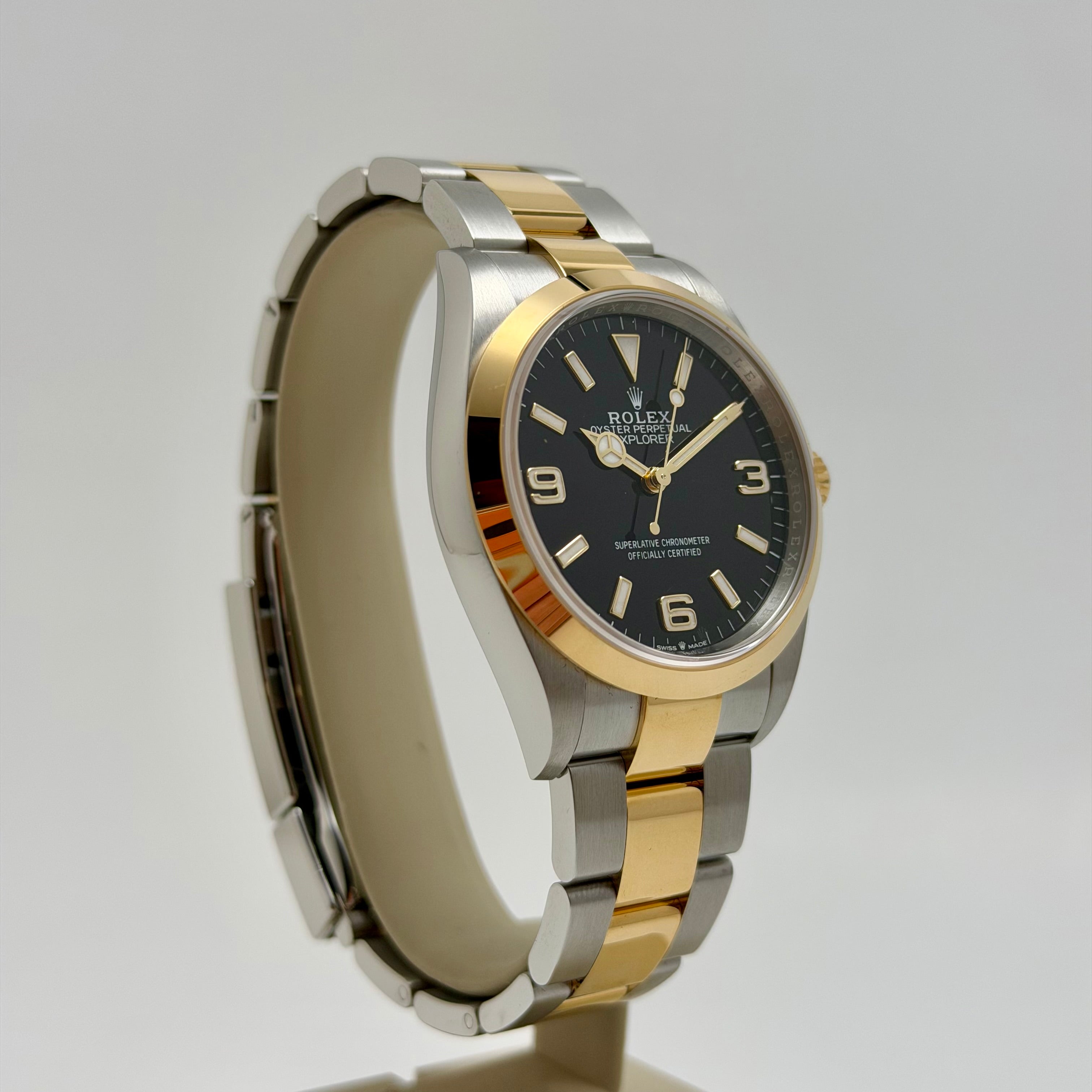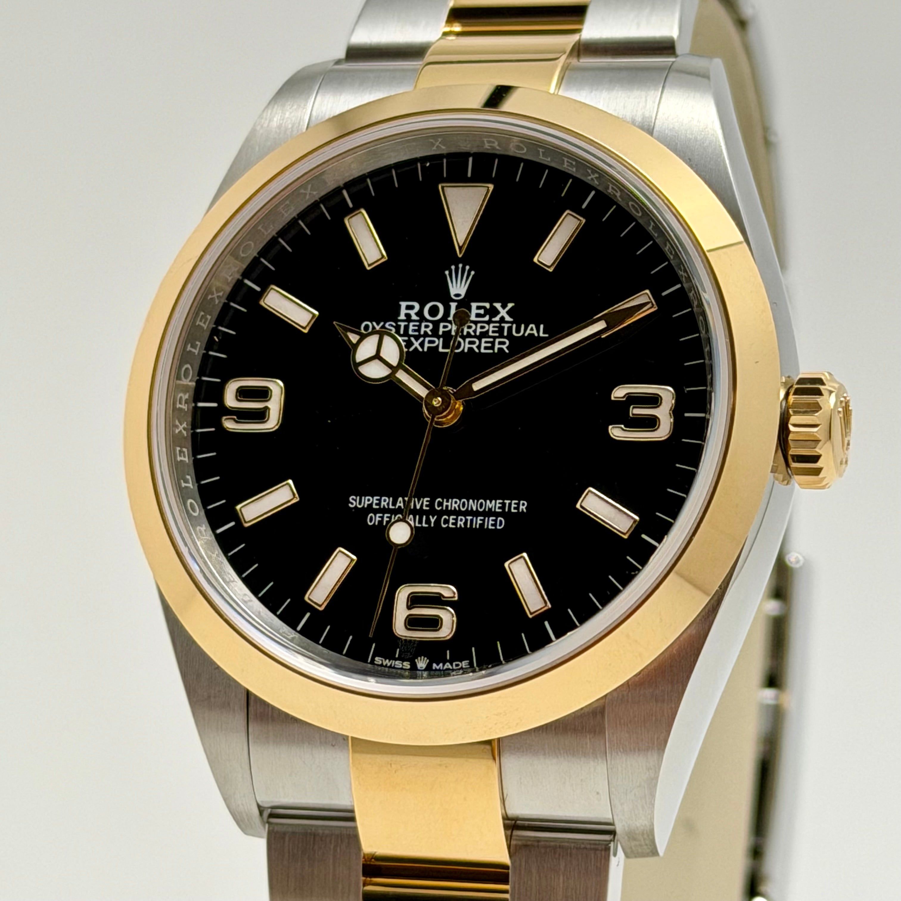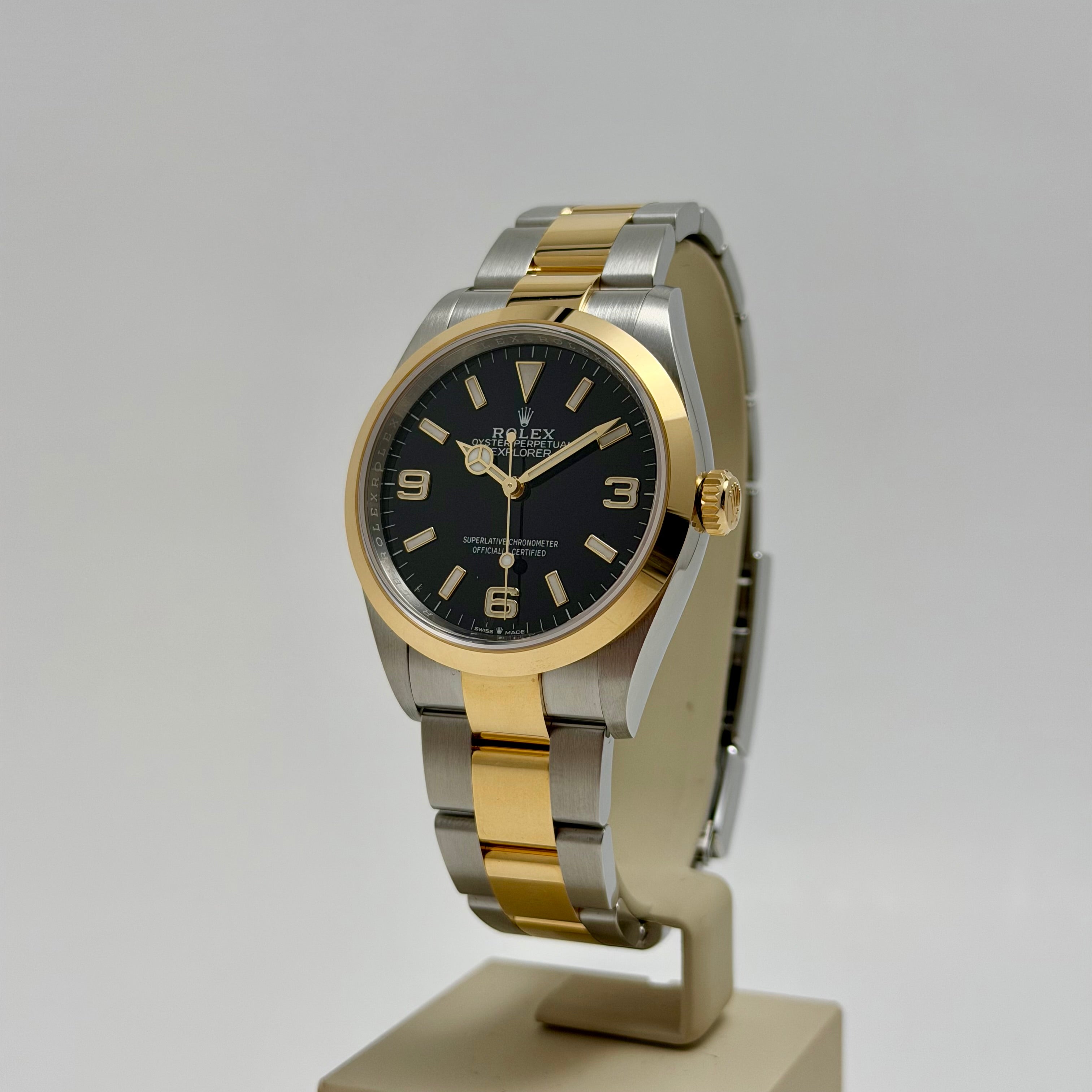 This 2021 pre-owned Rolex Explorer 36, reference 124273, represents a stunning fusion of rugged heritage and refined luxury. Presented in a striking combination of Oystersteel and 18K yellow gold, this Rolesor model returns the Explorer to its classic 36mm proportions. The distinctive black dial features the iconic 3, 6, and 9 numerals coated in Chromalight for exceptional legibility in any environment. Inside, the watch is driven by the high-performance caliber 3230 movement, offering a 70-hour power reserve and Superlative Chronometer precision. Complete with its signature Oyster bracelet, this timepiece is a versatile companion for both formal settings and outdoor adventures.