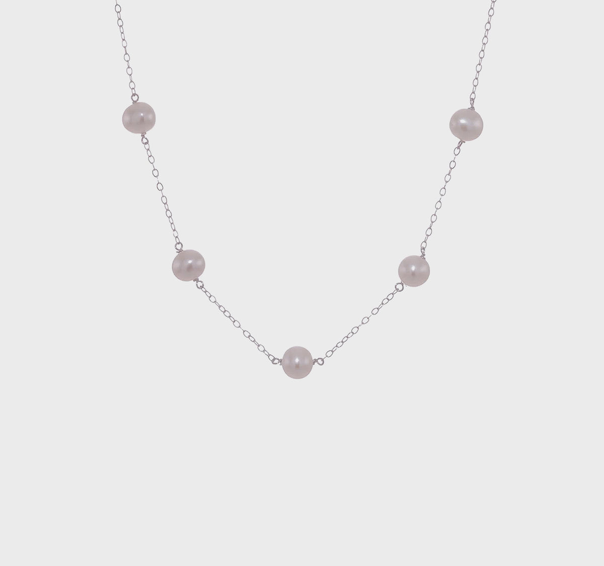 This elegant 16 inch necklace is crafted in fine sterling silver and features twelve luminous fresh water pearls delicately spaced along a polished chain. Each pearl measures between 6-7mm, offering a beautiful, natural lustre that adds a touch of classic sophistication to the neckline. The station-style design provides a modern, airy feel compared to a traditional pearl strand, making it a versatile choice for both professional attire and special occasions. Finished with a secure clasp, this piece is a refined essential that brings a graceful and timeless aesthetic to any jewellery collection.